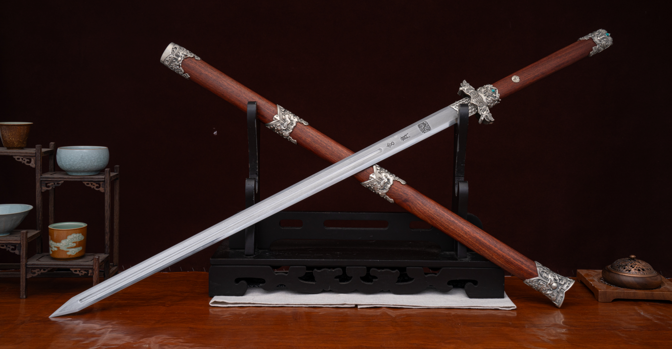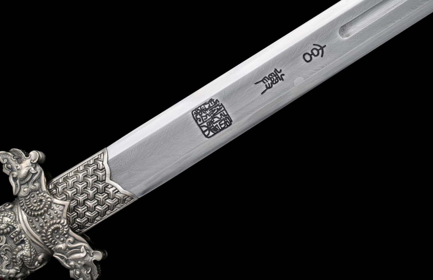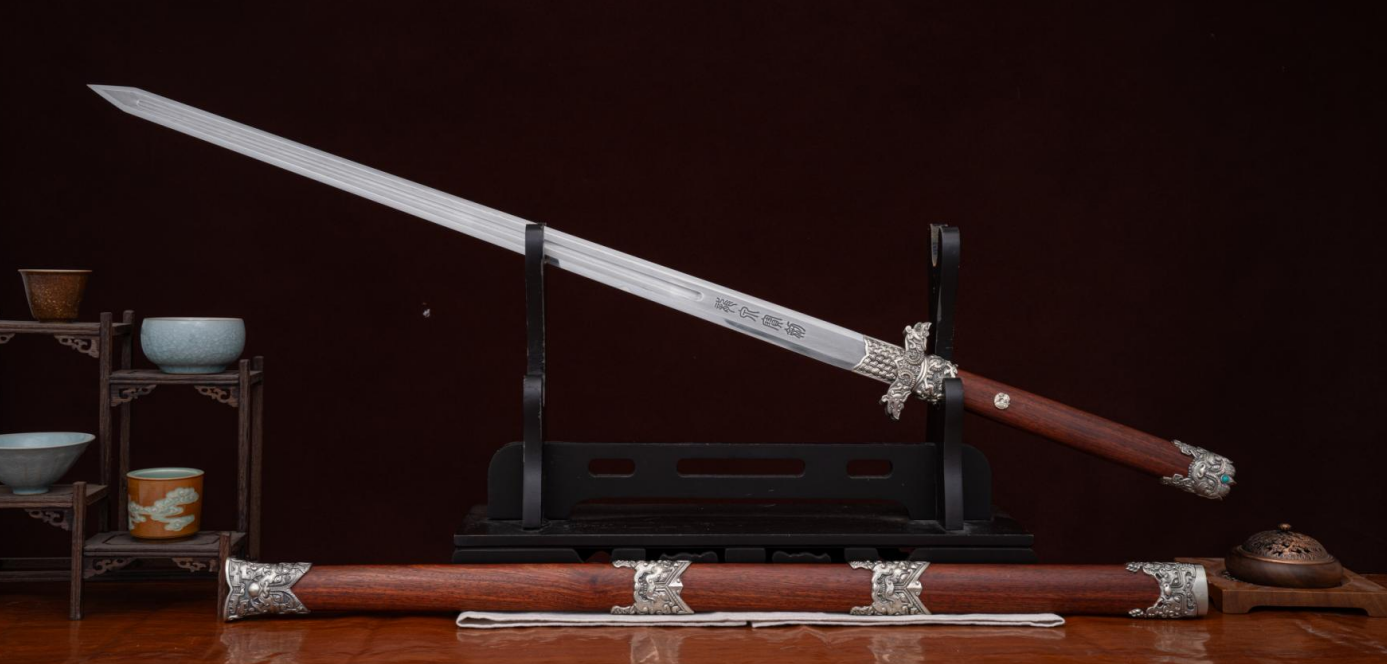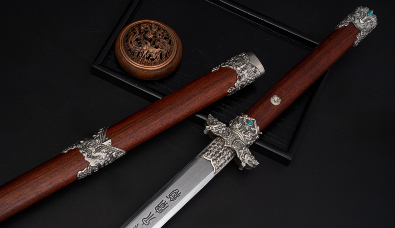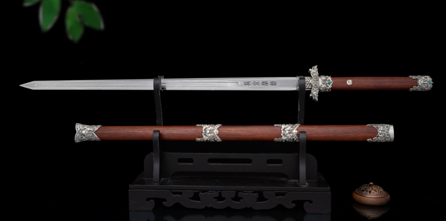 剑身流转的羽毛纹,是火与铁的对话;血檀木鞘的温润,是岁月的沉淀;白铜装具上的龙纹,是文化的烙印。当这柄玄尊剑静置于书房一角,它不再是一件冰冷的兵器,而是今日铸剑匠人对工艺和文化的传承与坚守,更加时承载着那份对正义、勇气和美的追求。