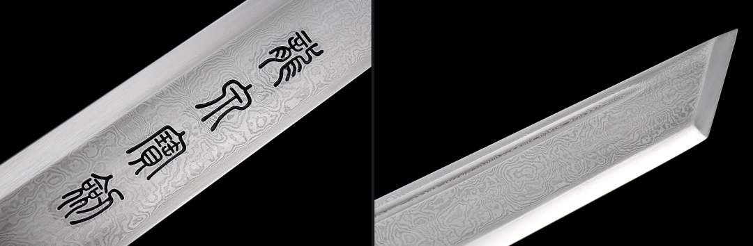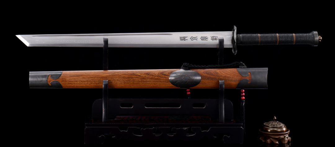 在制作工艺上,这柄大龙泉刀全程承袭传统规范。刀身采用唐刀切刃设计,核心选用百炼花纹钢,经传统百炼钢精锻工艺反复折叠锻打,在剔除钢材杂质的同时提升金属密度,形成自然独特的锻打纹理;结合古法覆土烧刃技艺,通过精准控温使刃部与刀身形成不同的硬度分区,兼顾刃口硬度与刀身韧性。刀身尺寸大于多数常规同类型刀具,入手有沉甸质感,挥动时自带沉猛气场。刀鞘选用龙凤檀木制作,纹理天然雅致,触感温润细腻;刀柄采用绕绳工艺,绳结紧密贴合柄身弧度,可增强握持防滑性,兼顾把玩的舒适感。